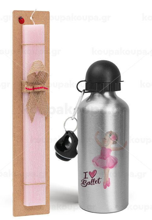 I Love Ballet, Πασχαλινή Λαμπάδα με παγούρι μεταλλικό Ασημένιο αλουμινίου (500ml) & κερί αρωματικό πλακέ (30cm) (ΡΟΖ)