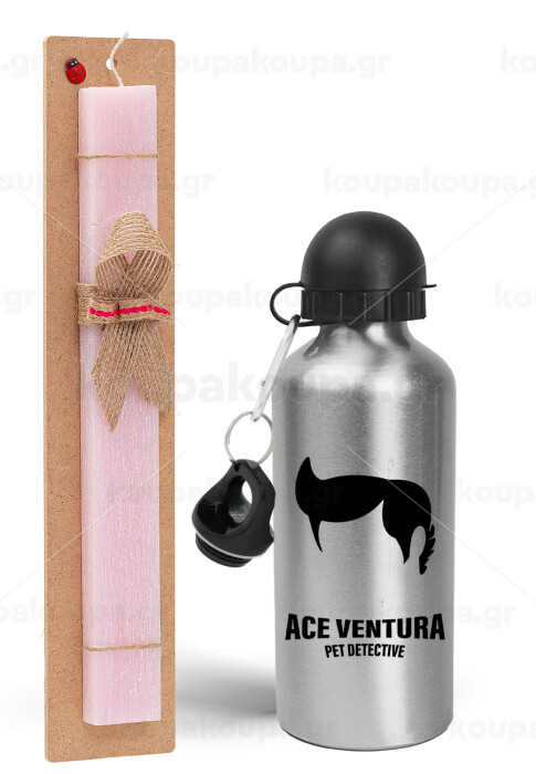 Ace Ventura Pet Detective, Πασχαλινή Λαμπάδα με παγούρι μεταλλικό Ασημένιο αλουμινίου (500ml) & κερί αρωματικό πλακέ (30cm) (ΡΟΖ)