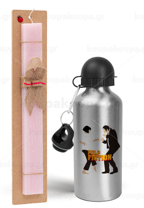 Pulp Fiction dancing, Πασχαλινή Λαμπάδα με παγούρι μεταλλικό Ασημένιο αλουμινίου (500ml) & κερί αρωματικό πλακέ (30cm) (ΡΟΖ)