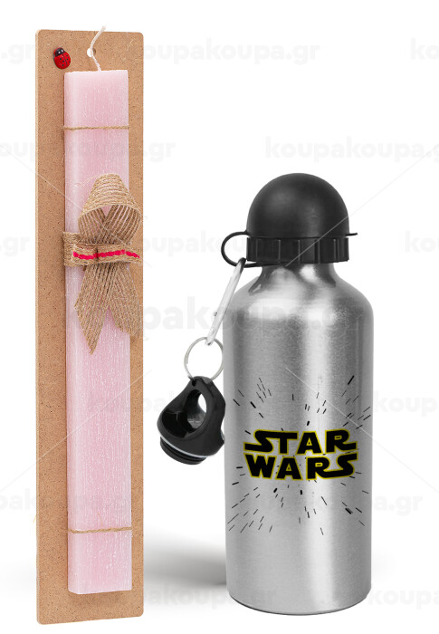 Star Wars, Πασχαλινή Λαμπάδα με παγούρι μεταλλικό Ασημένιο αλουμινίου (500ml) & κερί αρωματικό πλακέ (30cm) (ΡΟΖ)