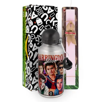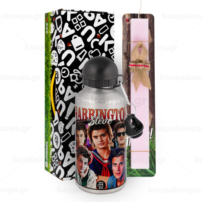 Steve Harrington, Stranger Things, Πασχαλινή Λαμπάδα με παγούρι μεταλλικό Ασημένιο αλουμινίου (500ml) & κερί αρωματικό πλακέ (30cm) (ΡΟΖ)