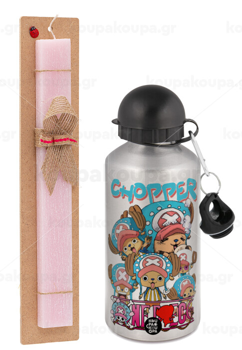 Chopper One Piece, Πασχαλινή Λαμπάδα με παγούρι μεταλλικό Ασημένιο αλουμινίου (500ml) & κερί αρωματικό πλακέ (30cm) (ΡΟΖ)