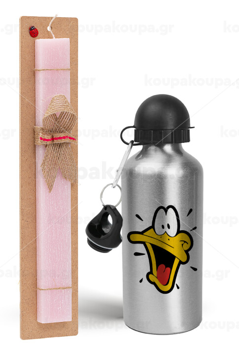 Daffy Duck, Πασχαλινή Λαμπάδα με παγούρι μεταλλικό Ασημένιο αλουμινίου (500ml) & κερί αρωματικό πλακέ (30cm) (ΡΟΖ)
