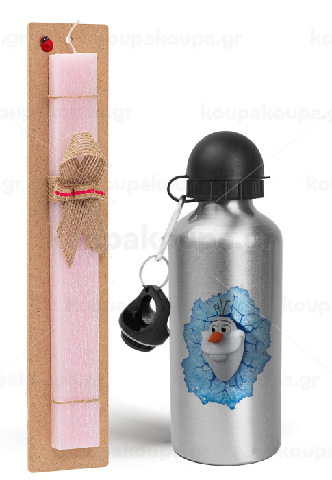 Frozen Olaf, Πασχαλινή Λαμπάδα με παγούρι μεταλλικό Ασημένιο αλουμινίου (500ml) & κερί αρωματικό πλακέ (30cm) (ΡΟΖ)