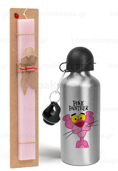 Pink Panther cartoon, Πασχαλινή Λαμπάδα με παγούρι μεταλλικό Ασημένιο αλουμινίου (500ml) & κερί αρωματικό πλακέ (30cm) (ΡΟΖ)