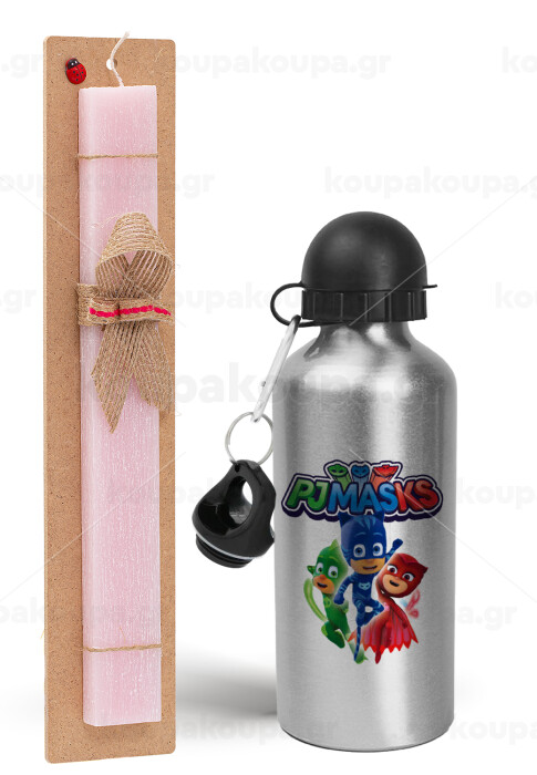 PJ masks, Πασχαλινή Λαμπάδα με παγούρι μεταλλικό Ασημένιο αλουμινίου (500ml) & κερί αρωματικό πλακέ (30cm) (ΡΟΖ)