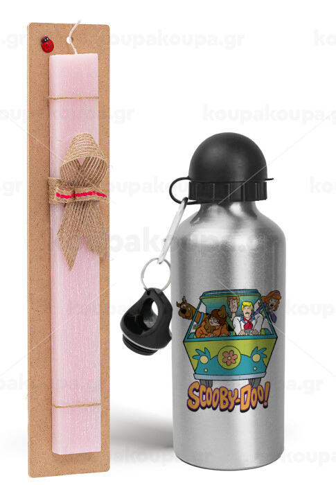 Scooby Doo car, Πασχαλινή Λαμπάδα με παγούρι μεταλλικό Ασημένιο αλουμινίου (500ml) & κερί αρωματικό πλακέ (30cm) (ΡΟΖ)
