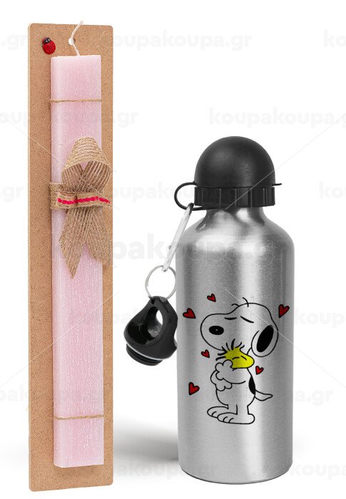 Snoopy Love, Πασχαλινή Λαμπάδα με παγούρι μεταλλικό Ασημένιο αλουμινίου (500ml) & κερί αρωματικό πλακέ (30cm) (ΡΟΖ)