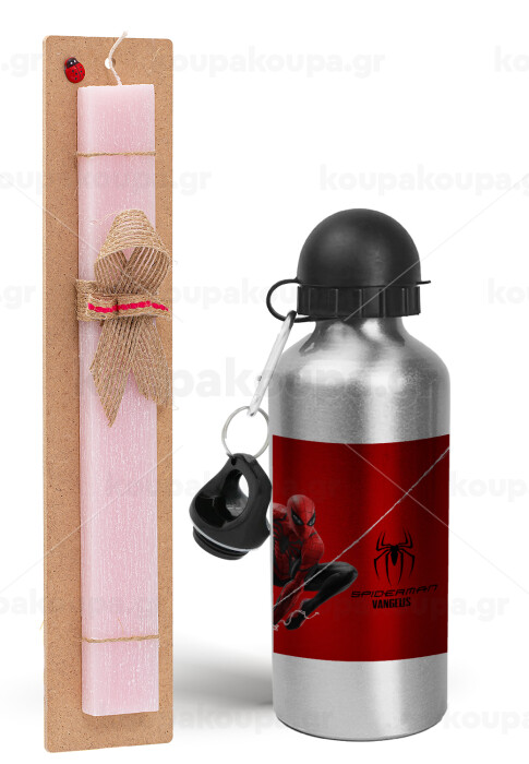 Spiderman, Πασχαλινή Λαμπάδα με παγούρι μεταλλικό Ασημένιο αλουμινίου (500ml) & κερί αρωματικό πλακέ (30cm) (ΡΟΖ)
