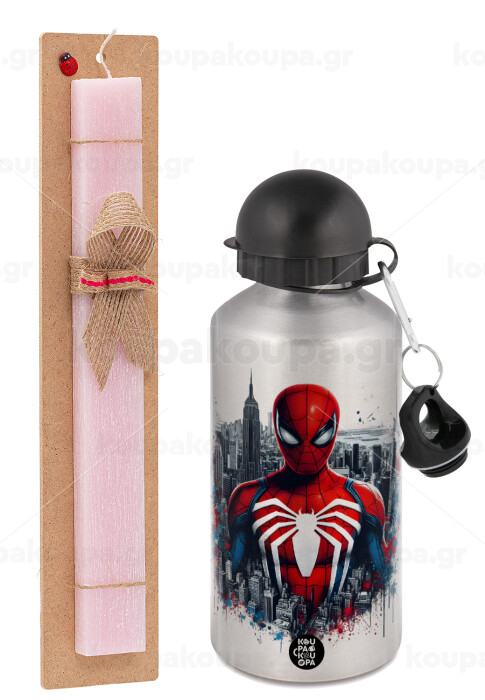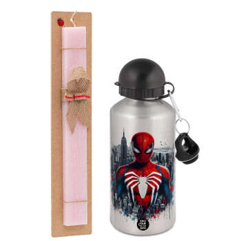 Spiderman City, Πασχαλινή Λαμπάδα με παγούρι μεταλλικό Ασημένιο αλουμινίου (500ml) & κερί αρωματικό πλακέ (30cm) (ΡΟΖ)
