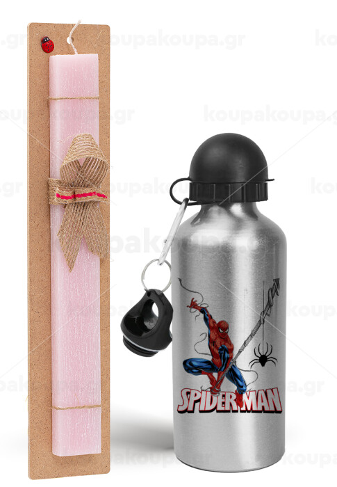 Spiderman fly, Πασχαλινή Λαμπάδα με παγούρι μεταλλικό Ασημένιο αλουμινίου (500ml) & κερί αρωματικό πλακέ (30cm) (ΡΟΖ)