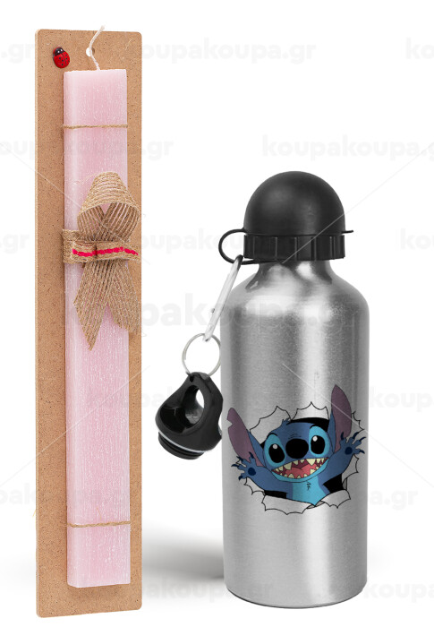 Stitch hello!!!, Πασχαλινή Λαμπάδα με παγούρι μεταλλικό Ασημένιο αλουμινίου (500ml) & κερί αρωματικό πλακέ (30cm) (ΡΟΖ)