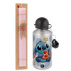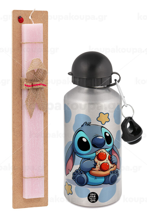 Stitch Pizza, Πασχαλινή Λαμπάδα με παγούρι μεταλλικό Ασημένιο αλουμινίου (500ml) & κερί αρωματικό πλακέ (30cm) (ΡΟΖ)