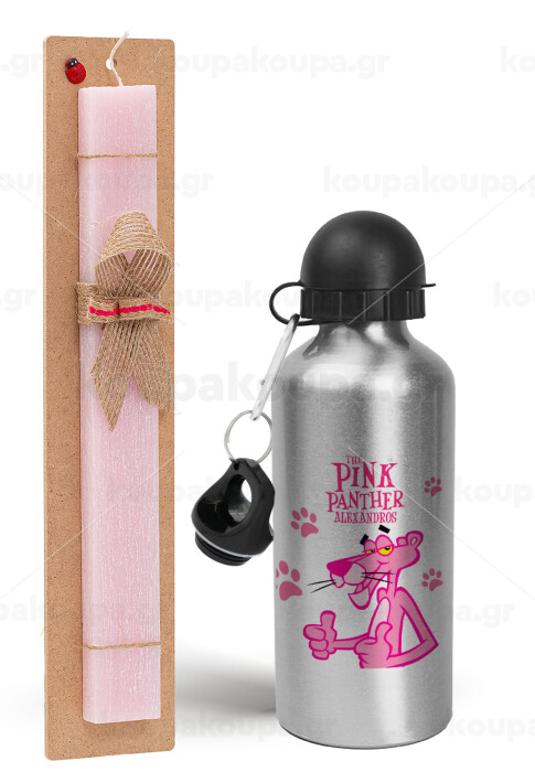 The pink panther, Πασχαλινή Λαμπάδα με παγούρι μεταλλικό Ασημένιο αλουμινίου (500ml) & κερί αρωματικό πλακέ (30cm) (ΡΟΖ)
