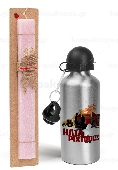 Ηλία ρίχτοοο!!!, Πασχαλινή Λαμπάδα με παγούρι μεταλλικό Ασημένιο αλουμινίου (500ml) & κερί αρωματικό πλακέ (30cm) (ΡΟΖ)