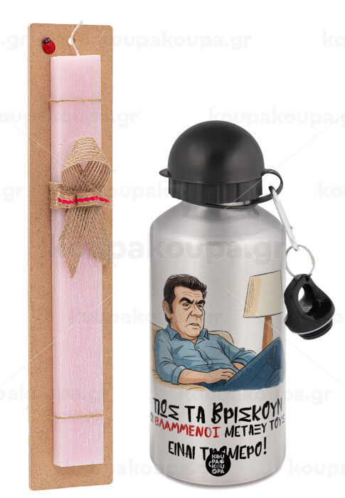 ΠΩΣ ΤΑ ΒΡΙΣΚΟΥΝ ΟΙ ΒΛΑ....ΝΟΙ ΜΕΤΑΞΥ ΤΟΥΣ, ΕΙΝΑΙ ΤΡΟΜΕΡΟ!!!, Πασχαλινή Λαμπάδα με παγούρι μεταλλικό Ασημένιο αλουμινίου (500ml) & κερί αρωματικό πλακέ (30cm) (ΡΟΖ)