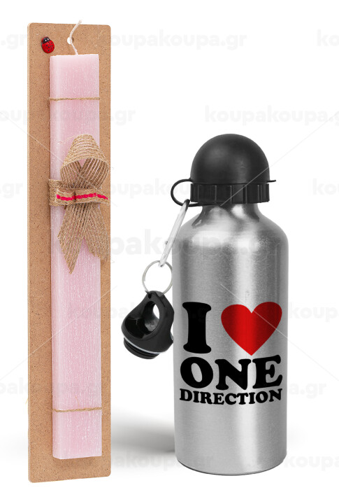 I Love, One Direction, Πασχαλινή Λαμπάδα με παγούρι μεταλλικό Ασημένιο αλουμινίου (500ml) & κερί αρωματικό πλακέ (30cm) (ΡΟΖ)