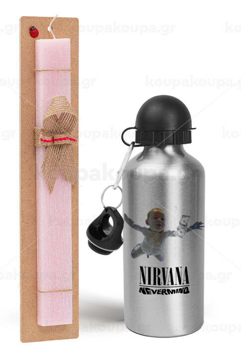 Nirvana nevermind, Πασχαλινή Λαμπάδα με παγούρι μεταλλικό Ασημένιο αλουμινίου (500ml) & κερί αρωματικό πλακέ (30cm) (ΡΟΖ)