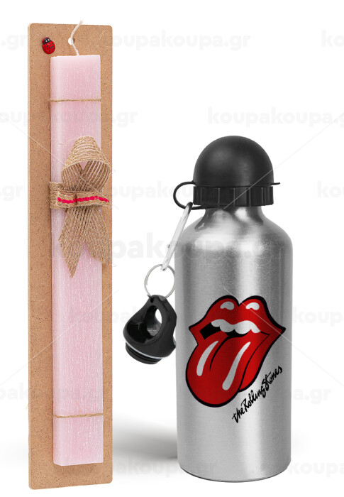 The rolling stones, Πασχαλινή Λαμπάδα με παγούρι μεταλλικό Ασημένιο αλουμινίου (500ml) & κερί αρωματικό πλακέ (30cm) (ΡΟΖ)