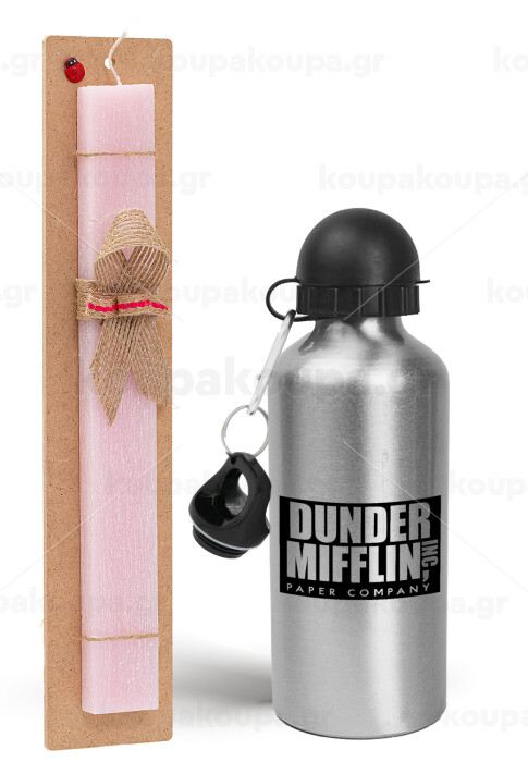 Dunder Mifflin, Inc Paper Company, Πασχαλινή Λαμπάδα με παγούρι μεταλλικό Ασημένιο αλουμινίου (500ml) & κερί αρωματικό πλακέ (30cm) (ΡΟΖ)