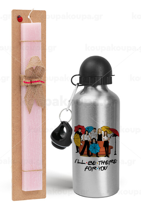 Friends cover, Πασχαλινή Λαμπάδα με παγούρι μεταλλικό Ασημένιο αλουμινίου (500ml) & κερί αρωματικό πλακέ (30cm) (ΡΟΖ)