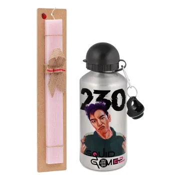 Squid game 2, Thanos 230, Πασχαλινή Λαμπάδα με παγούρι μεταλλικό Ασημένιο αλουμινίου (500ml) & κερί αρωματικό πλακέ (30cm) (ΡΟΖ)