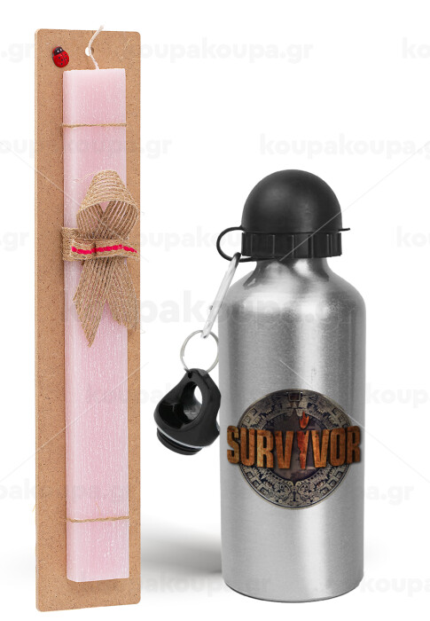 Survivor, Πασχαλινή Λαμπάδα με παγούρι μεταλλικό Ασημένιο αλουμινίου (500ml) & κερί αρωματικό πλακέ (30cm) (ΡΟΖ)