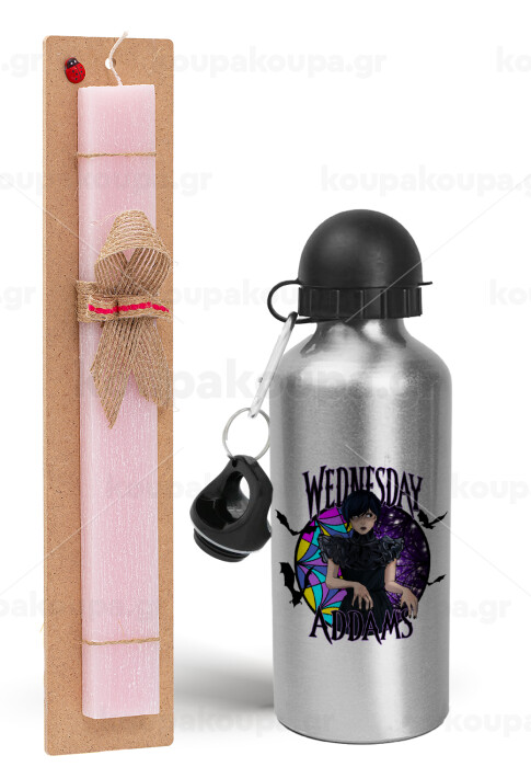 Wednesday Jenna Ortega, Πασχαλινή Λαμπάδα με παγούρι μεταλλικό Ασημένιο αλουμινίου (500ml) & κερί αρωματικό πλακέ (30cm) (ΡΟΖ)