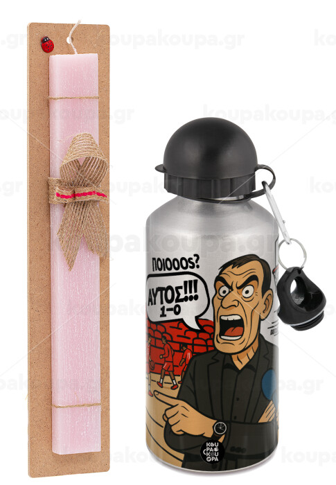 Μπαρτζό, Ποιος? Αυτός!!! 1-0, Πασχαλινή Λαμπάδα με παγούρι μεταλλικό Ασημένιο αλουμινίου (500ml) & κερί αρωματικό πλακέ (30cm) (ΡΟΖ)