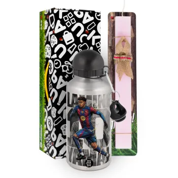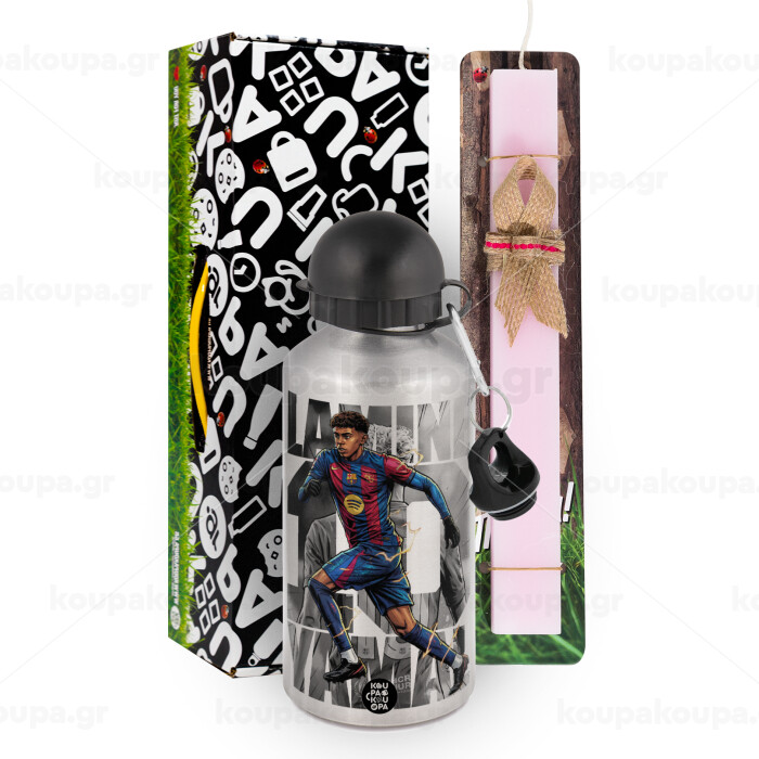 Lamine Yamal (Λαμίν Γιαμάλ), Πασχαλινή Λαμπάδα με παγούρι μεταλλικό Ασημένιο αλουμινίου (500ml) & κερί αρωματικό πλακέ (30cm) (ΡΟΖ)