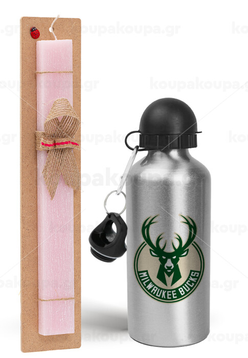 Milwaukee bucks, Πασχαλινή Λαμπάδα με παγούρι μεταλλικό Ασημένιο αλουμινίου (500ml) & κερί αρωματικό πλακέ (30cm) (ΡΟΖ)