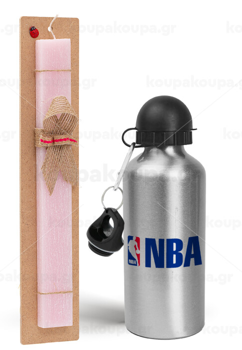 NBA, Πασχαλινή Λαμπάδα με παγούρι μεταλλικό Ασημένιο αλουμινίου (500ml) & κερί αρωματικό πλακέ (30cm) (ΡΟΖ)