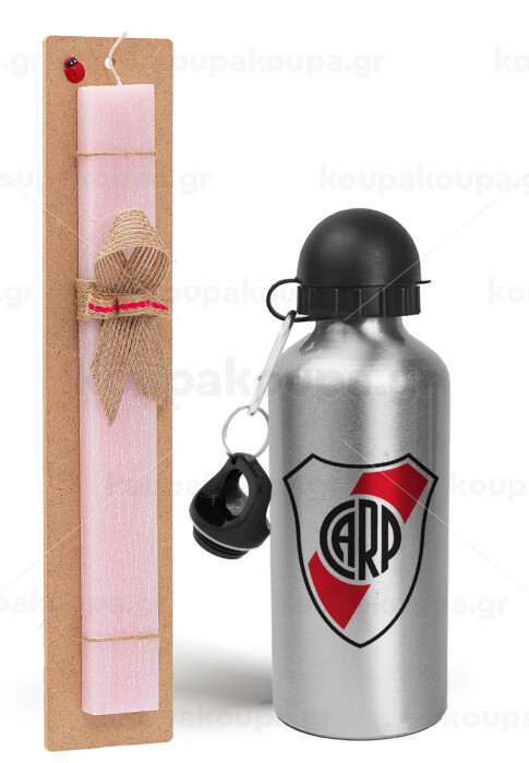 River Plate, Πασχαλινή Λαμπάδα με παγούρι μεταλλικό Ασημένιο αλουμινίου (500ml) & κερί αρωματικό πλακέ (30cm) (ΡΟΖ)