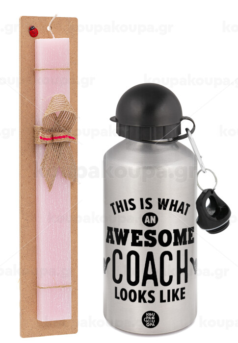 This is what an awesome COACH looks like!, Πασχαλινή Λαμπάδα με παγούρι μεταλλικό Ασημένιο αλουμινίου (500ml) & κερί αρωματικό πλακέ (30cm) (ΡΟΖ)