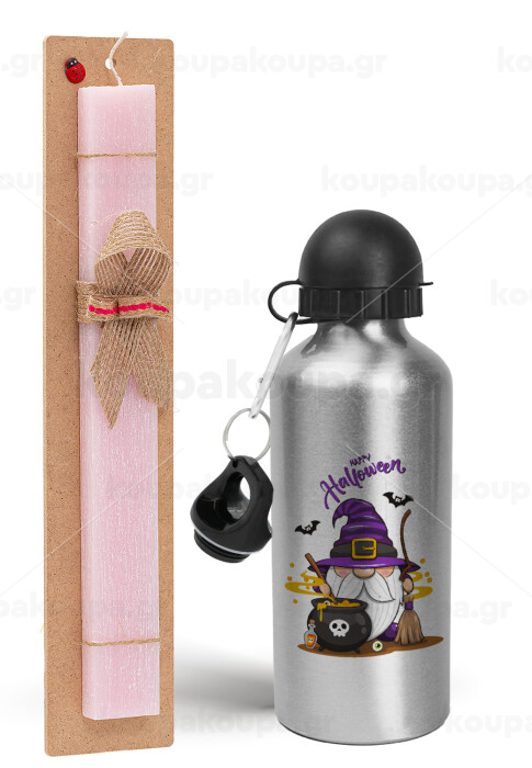 Happy Halloween (Χαλοουίν), Πασχαλινή Λαμπάδα με παγούρι μεταλλικό Ασημένιο αλουμινίου (500ml) & κερί αρωματικό πλακέ (30cm) (ΡΟΖ)