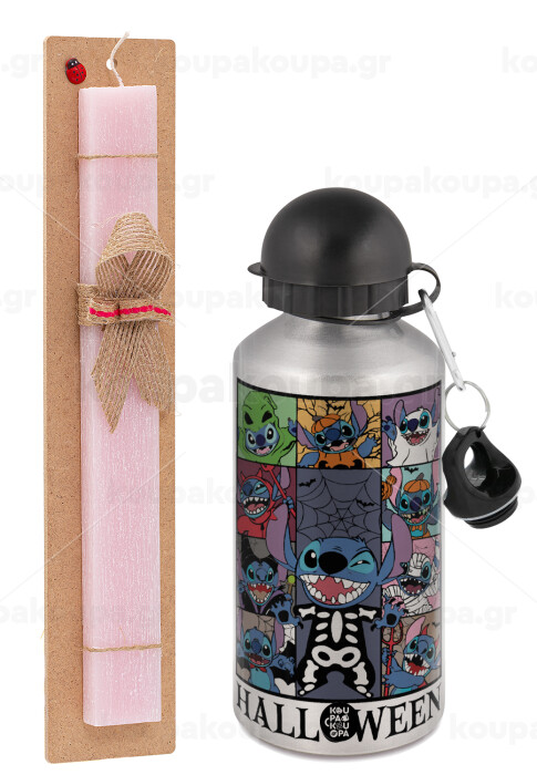 Stitch Halloween, Πασχαλινή Λαμπάδα με παγούρι μεταλλικό Ασημένιο αλουμινίου (500ml) & κερί αρωματικό πλακέ (30cm) (ΡΟΖ)