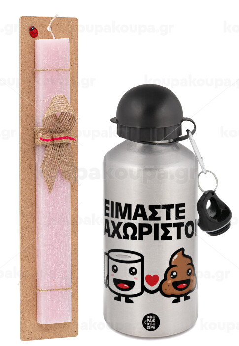 Είμαστε αχώριστοι, Πασχαλινή Λαμπάδα με παγούρι μεταλλικό Ασημένιο αλουμινίου (500ml) & κερί αρωματικό πλακέ (30cm) (ΡΟΖ)