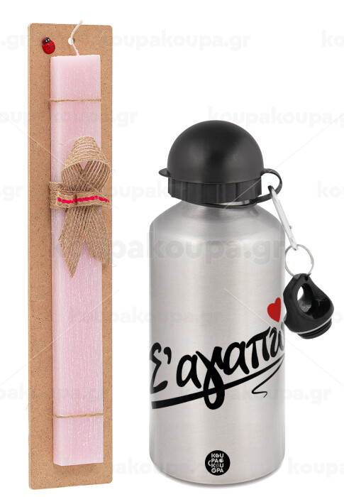 Σ΄ αγαπώ!!!, Πασχαλινή Λαμπάδα με παγούρι μεταλλικό Ασημένιο αλουμινίου (500ml) & κερί αρωματικό πλακέ (30cm) (ΡΟΖ)