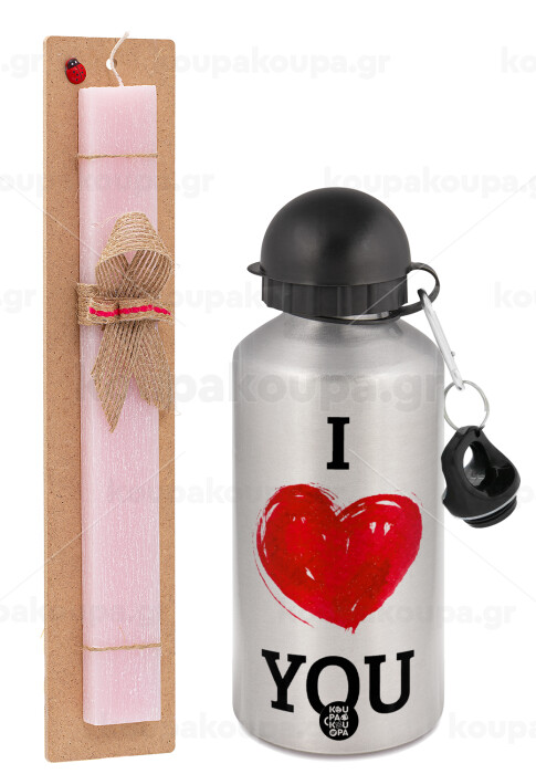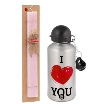 I Love You, Πασχαλινή Λαμπάδα με παγούρι μεταλλικό Ασημένιο αλουμινίου (500ml) & κερί αρωματικό πλακέ (30cm) (ΡΟΖ)