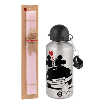 Love Car, Πασχαλινή Λαμπάδα με παγούρι μεταλλικό Ασημένιο αλουμινίου (500ml) & κερί αρωματικό πλακέ (30cm) (ΡΟΖ)