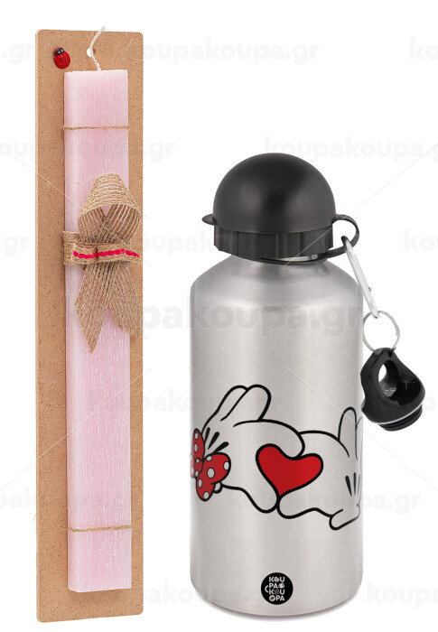 Love hands, Πασχαλινή Λαμπάδα με παγούρι μεταλλικό Ασημένιο αλουμινίου (500ml) & κερί αρωματικό πλακέ (30cm) (ΡΟΖ)