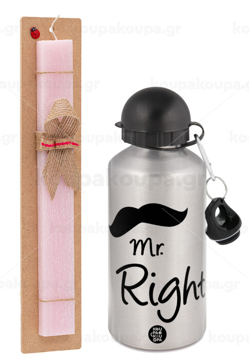 Mr right Mustache, Πασχαλινή Λαμπάδα με παγούρι μεταλλικό Ασημένιο αλουμινίου (500ml) & κερί αρωματικό πλακέ (30cm) (ΡΟΖ)