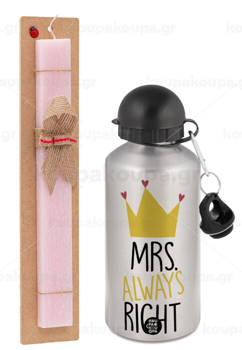 Mrs "Always" right, Πασχαλινή Λαμπάδα με παγούρι μεταλλικό Ασημένιο αλουμινίου (500ml) & κερί αρωματικό πλακέ (30cm) (ΡΟΖ)