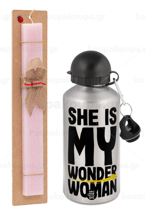 She is my wonder woman, Πασχαλινή Λαμπάδα με παγούρι μεταλλικό Ασημένιο αλουμινίου (500ml) & κερί αρωματικό πλακέ (30cm) (ΡΟΖ)