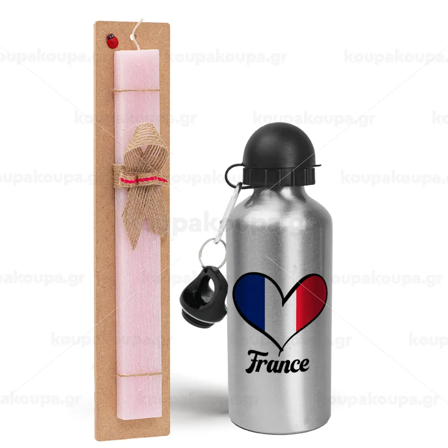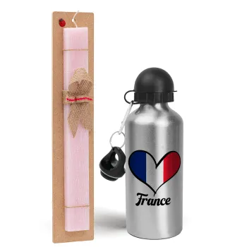 France flag, Πασχαλινή Λαμπάδα με παγούρι μεταλλικό Ασημένιο αλουμινίου (500ml) & κερί αρωματικό πλακέ (30cm) (ΡΟΖ)