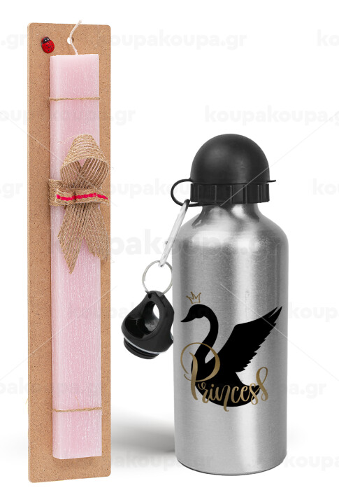 Swan Princess, Πασχαλινή Λαμπάδα με παγούρι μεταλλικό Ασημένιο αλουμινίου (500ml) & κερί αρωματικό πλακέ (30cm) (ΡΟΖ)
