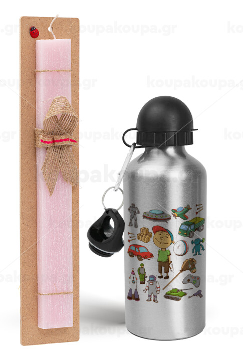 Toys Boy, Πασχαλινή Λαμπάδα με παγούρι μεταλλικό Ασημένιο αλουμινίου (500ml) & κερί αρωματικό πλακέ (30cm) (ΡΟΖ)
