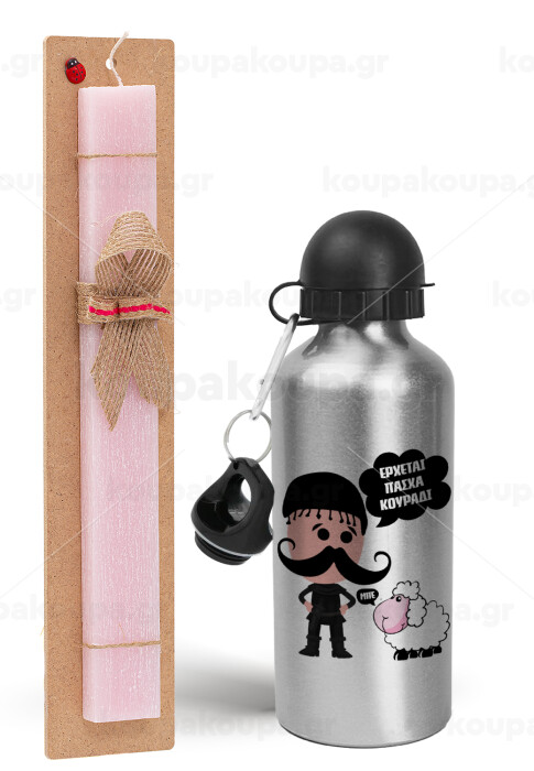 Κρητικός "Έρχεται Πάσχα κουράδι", Πασχαλινή Λαμπάδα με παγούρι μεταλλικό Ασημένιο αλουμινίου (500ml) & κερί αρωματικό πλακέ (30cm) (ΡΟΖ)