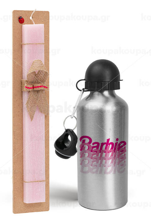 Barbie repeat, Πασχαλινή Λαμπάδα με παγούρι μεταλλικό Ασημένιο αλουμινίου (500ml) & κερί αρωματικό πλακέ (30cm) (ΡΟΖ)