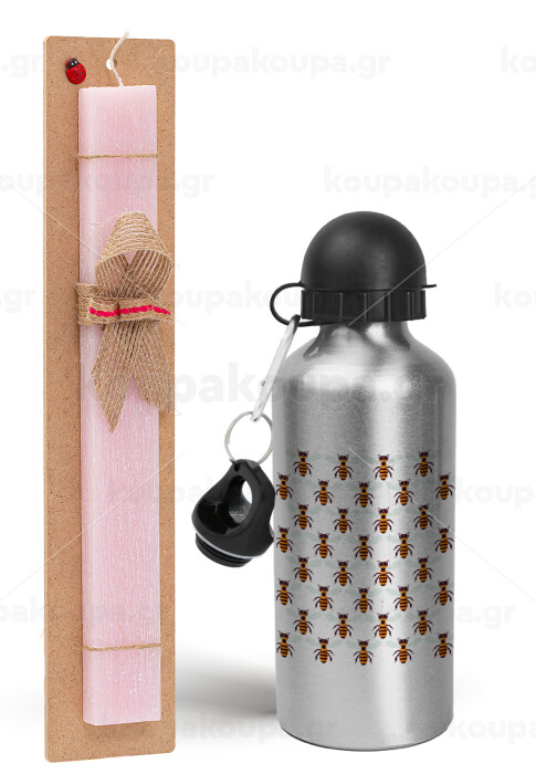 Μελισσούλες, Πασχαλινή Λαμπάδα με παγούρι μεταλλικό Ασημένιο αλουμινίου (500ml) & κερί αρωματικό πλακέ (30cm) (ΡΟΖ)